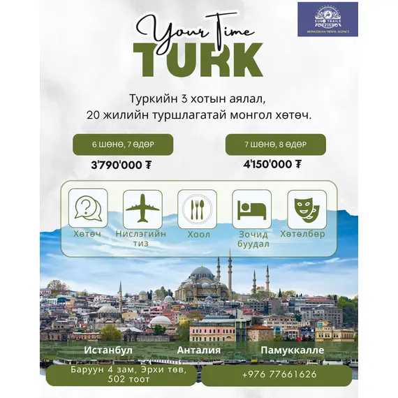 Турк улсын түүх, соёл, байгалийн гайхамшиг, далайн амралтыг нэг дор багтаасан 3 хотын хосолсон онцгой аялал-д таныг урьж байна.