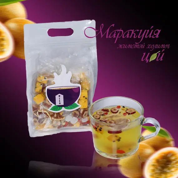 Маракуйяа холимог цай - Маракуяа нь витамин С болон эслэгээр баялаг. Үүрэндээ Омега-3 тосны хүчил зэрэг эрүүл өөх тос агуулдаг. Орцонд нь улаан чавга, улаан гожи , лайм , лимон , мөсөн чихэр орно. 10 ширхэг савалгаатай