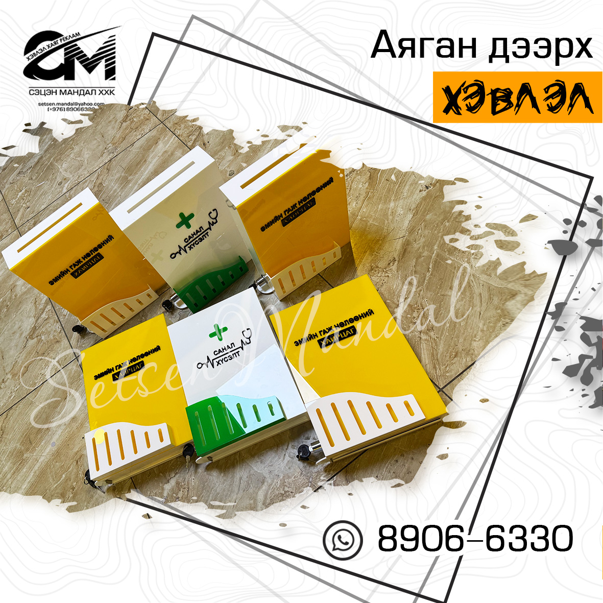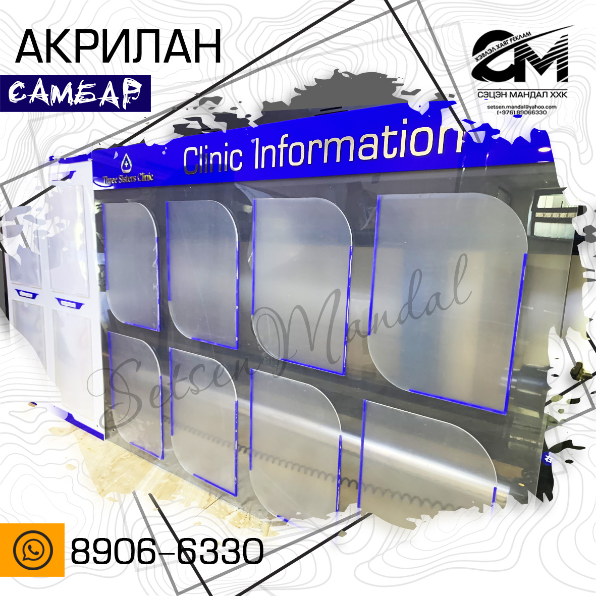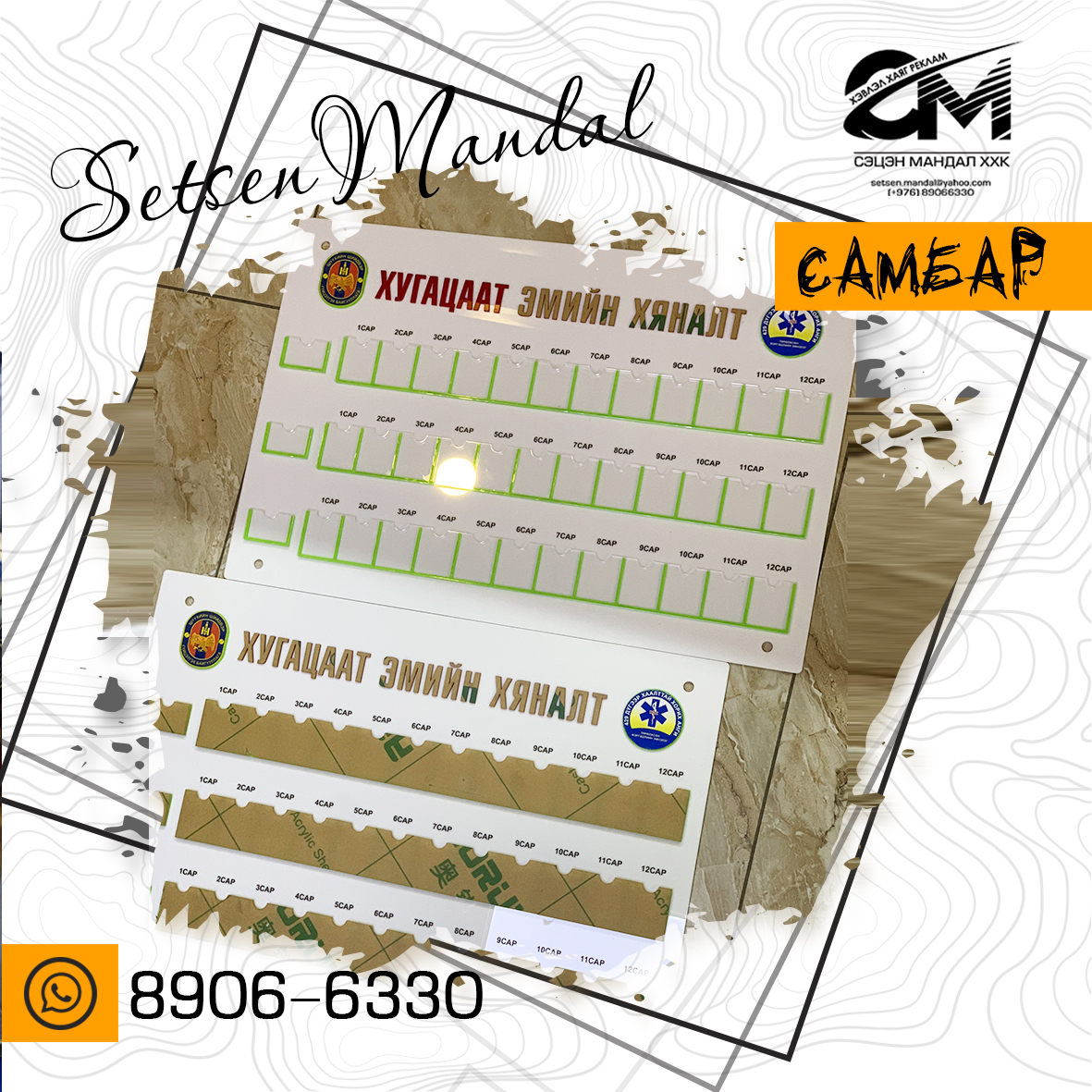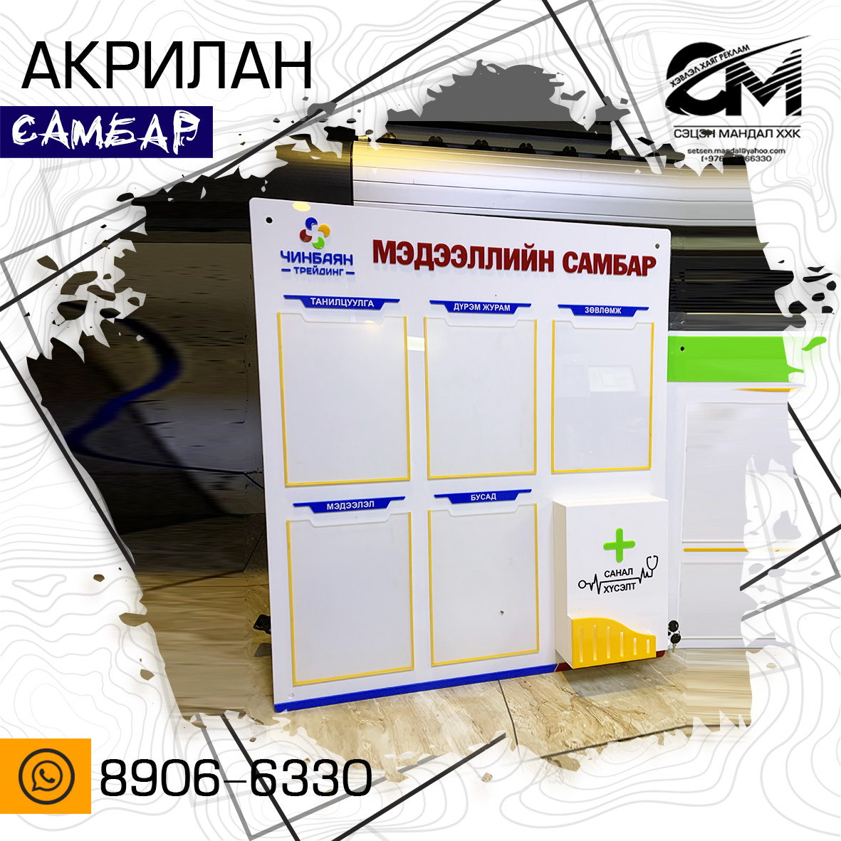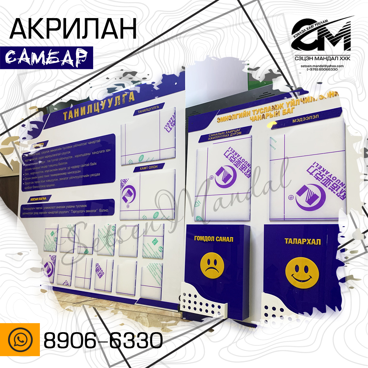 Акрил болон хөөсөн самбар бүхий рекламын бүтээгдэхүүн.
