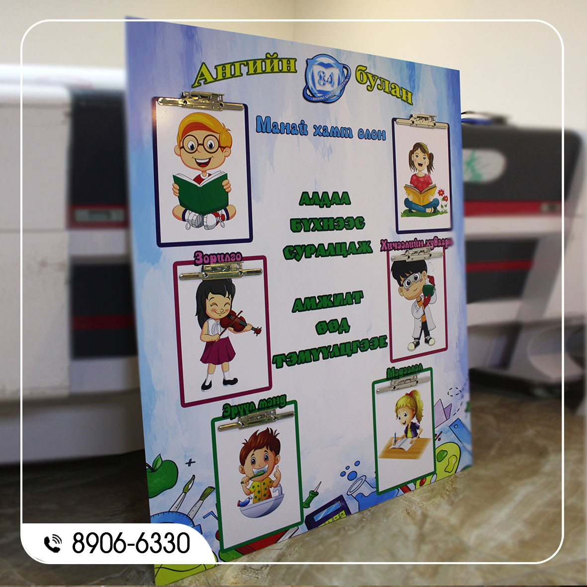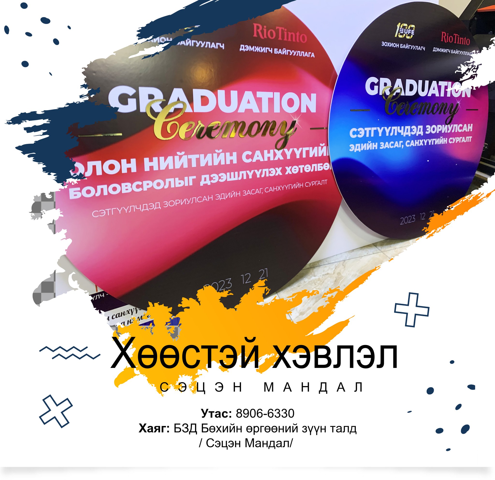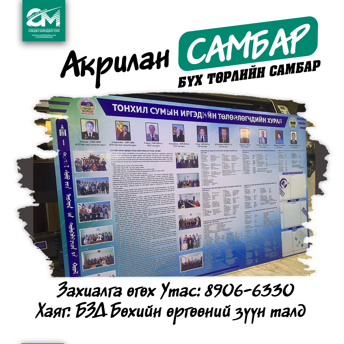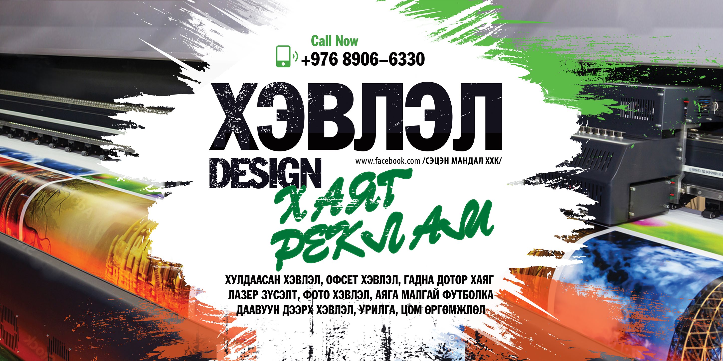 Манай хамт олон баннер, стенд, хулдаасан хэвлэл, медаль, цом, өргөмжлөл, хаяг реклам, товгор үсэг, акрилан болон хөөсөн самбар зэрэг төрөл бүрийн сурталчилгааны бүтээгдэхүүнийг захиалгаар хийж гүйцэтгэхээс гадна хувцсан дээрх хэвлэл, аяган дээрх хэвлэл зэрэг бэлгийн болон дурсгалын бүтээгдэхүүнийг хэрэглэгчдийн хүсэл, хэрэгцээнд нийцүүлэн хийж байна.