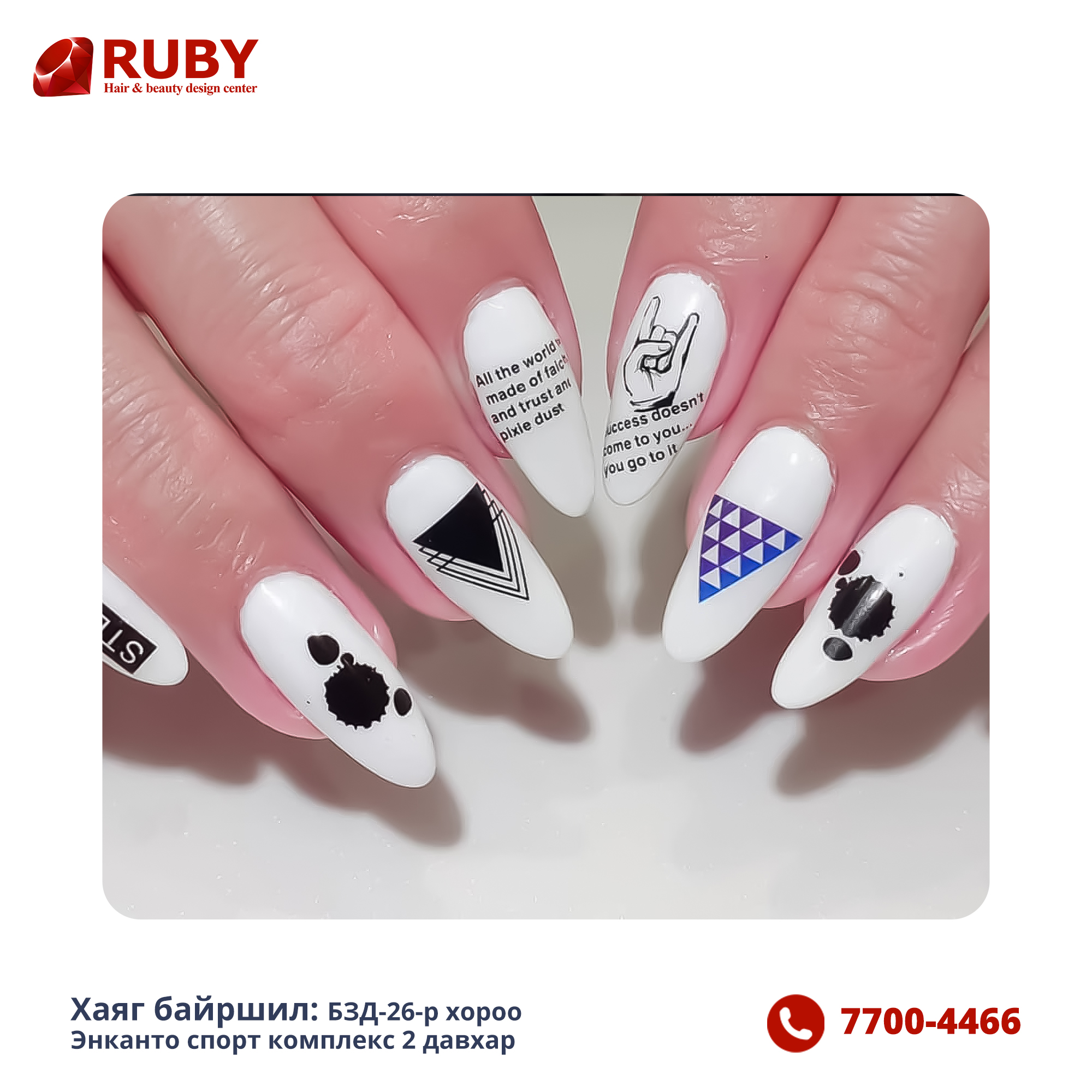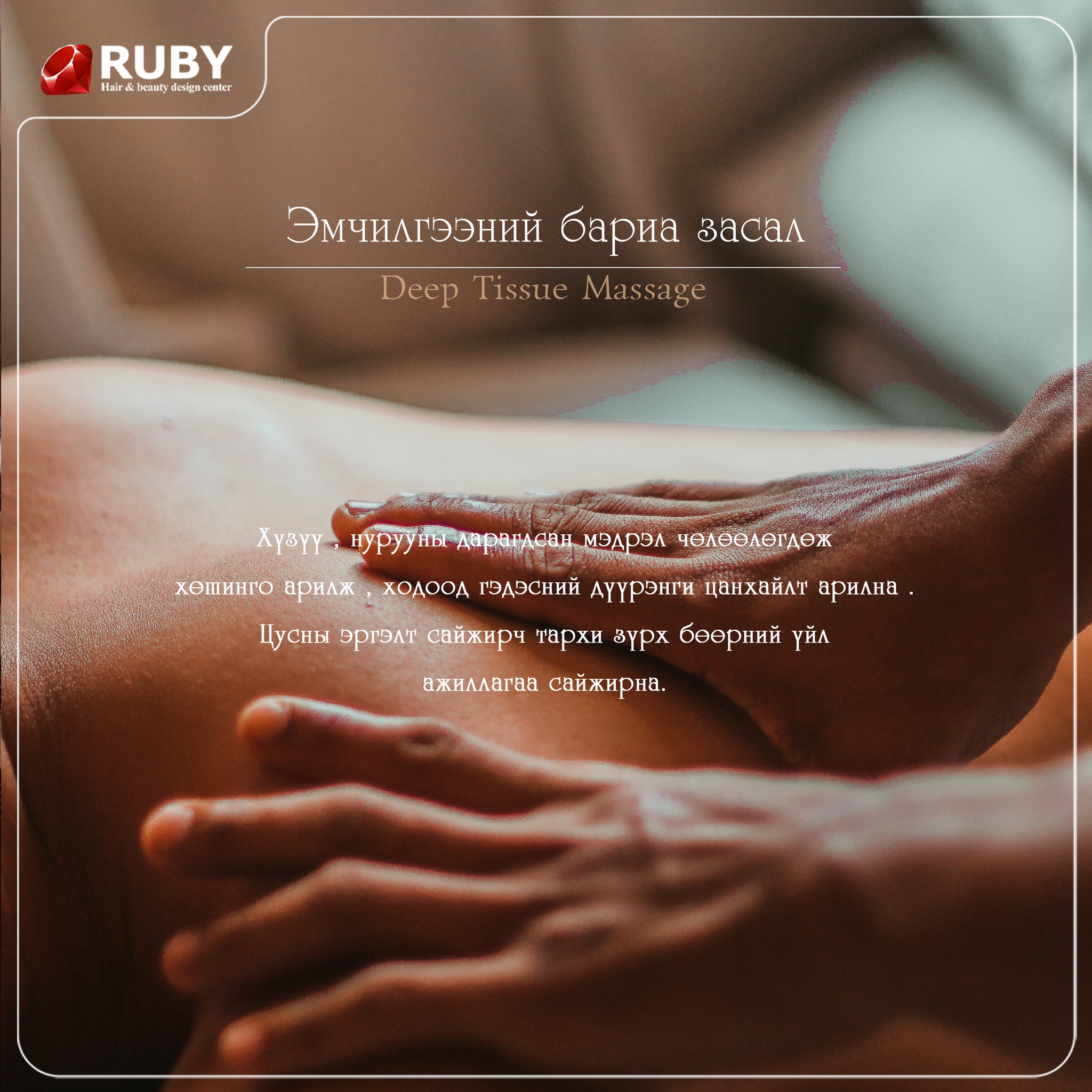 RUBY SALON-д үйлчлүүлснээр та зөвхөн гоо сайхан төдийгүй эрүүл, эрч хүчтэй, өөртөө итгэлтэй мэдрэмжийг авна. Энэ нь таны өдөр тутмын амьдралд энерги, урам зориг нэмнэ.