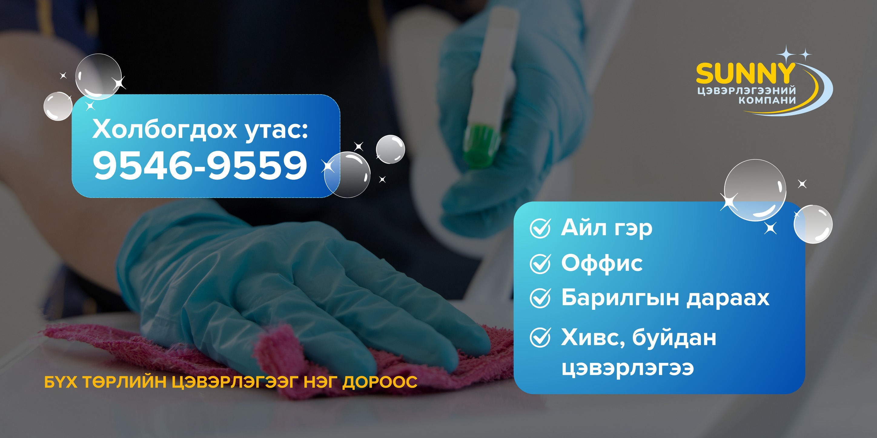 SUNNY Цэвэрлэгээний Үйлчилгээ нь Улаанбаатар хотод үйл ажиллагаа явуулдаг, мэргэжлийн, найдвартай цэвэрлэгээний байгууллага юм. Бид айл өрх, албан байгууллага, оффис, үйлчилгээний талбайд стандартын дагуу чанартай цэвэрлэгээний үйлчилгээг санал болгодог.