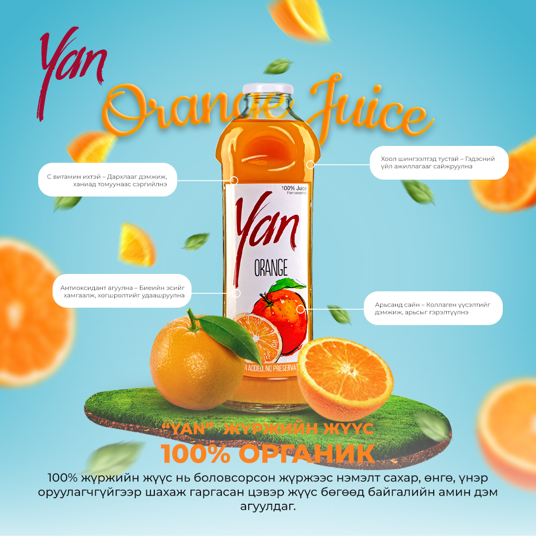 YAN Juice нь 100% байгалийн жимсээр хийгдсэн, цэвэр найрлагатай, амин дэмээр баялаг жүүс юм. Бид хэрэглэгчдэдээ байгалийн амт, чанарын баталгаа, олон улсын нэр хүндийг санал болгож байна.