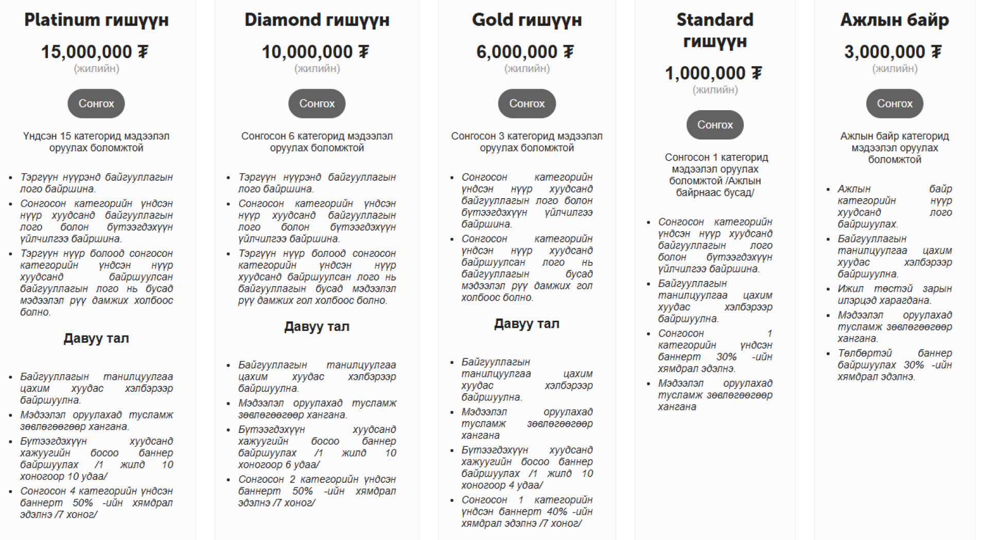 Та өөрийн бизнесээ сурталчлан таниулах танилцуулга хуудас байршуулж, бараа бүтээгдэхүүнээ борлуулах, ажилд авах зар оруулах зэргээр бизнесийн хүндрэл бэрхшээл асуудлаа шийдвэрлэхэд туслах санал болгож буй багцийн үйлчилгээтэй танилцаж, өөрийн хэрэгцээнд нийцэх багцийг сонгон, гишүүн хэрэглэгчээр бүртгүүлэн, биднээс зөвлөгөө, үйлчилгээ авах боломжтой.