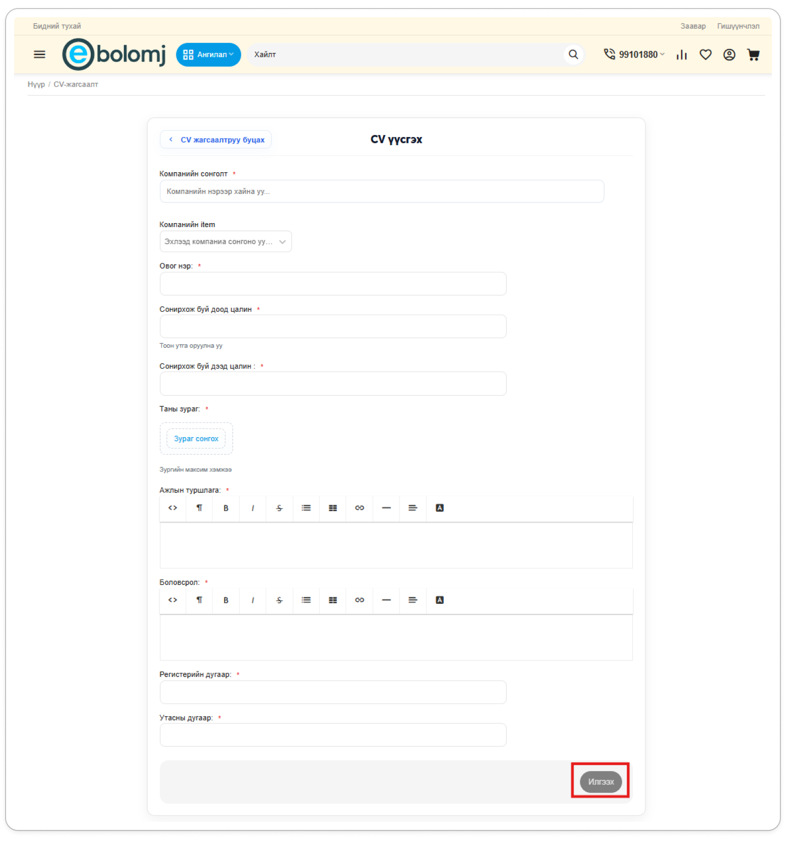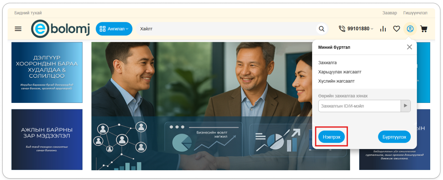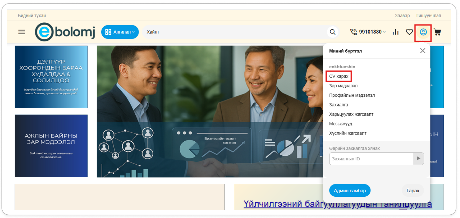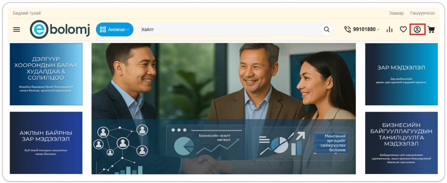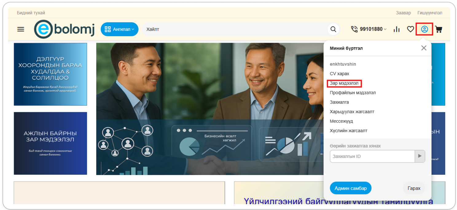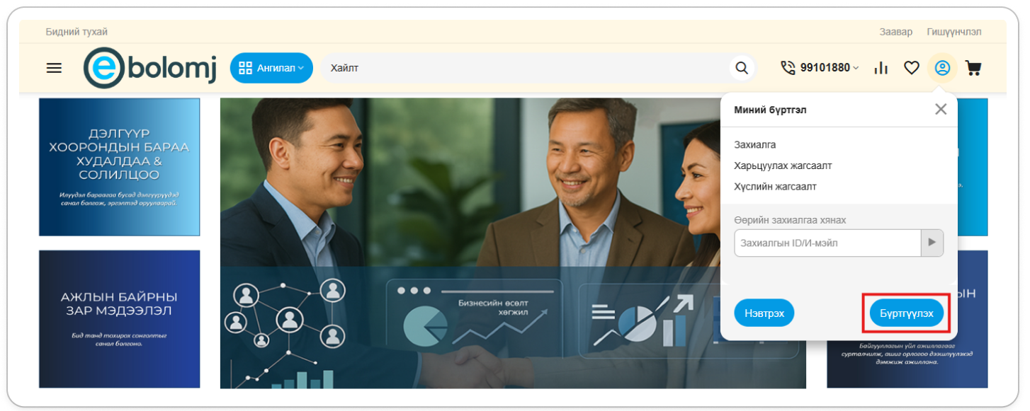 Энгийн хэрэглэгчийн бүртгэл үүсгэснээр Зар мэдээлэл оруулах, Ажилд орох хүсэлт илгээх, Худалдан авалт захиалга хийх боломжтой болно.