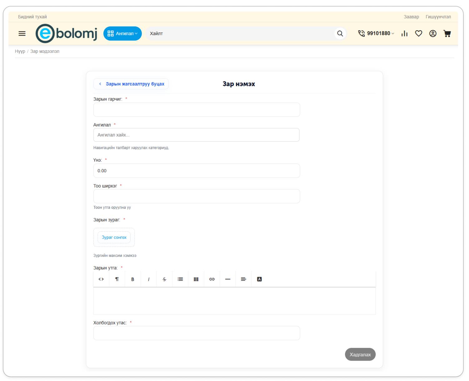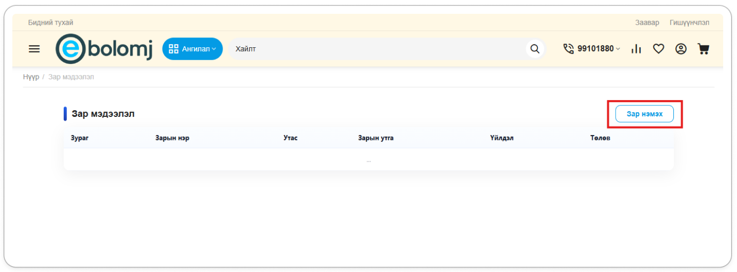 Ebolomj.mn сайт дээр хэрэглэгч та бараа бүтээгдэхүүн, үйлчилгээ, худалдаа, түрээс, сурталчилгаа гэх мэт төрөл бүрийн зар мэдээллийг ангилалтай, хялбар, үр дүнтэй байдлаар оруулах боломжтой.