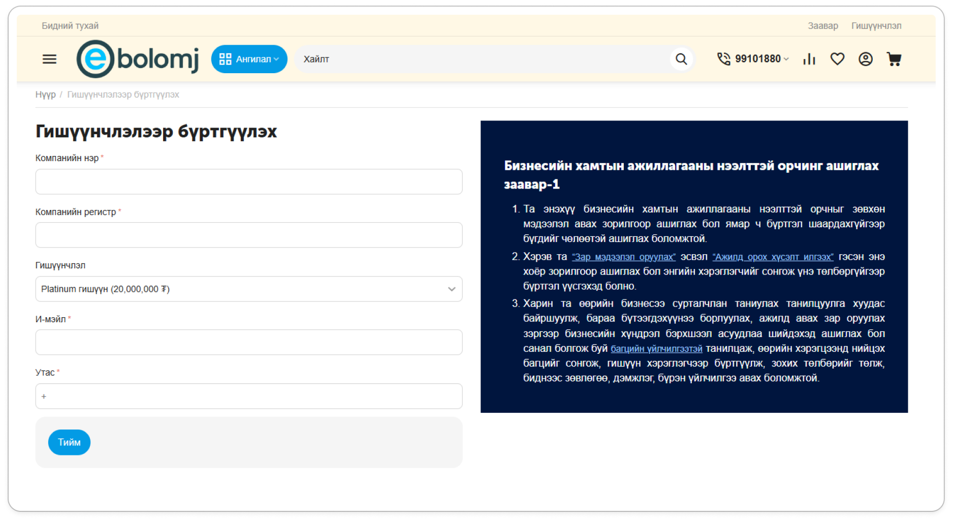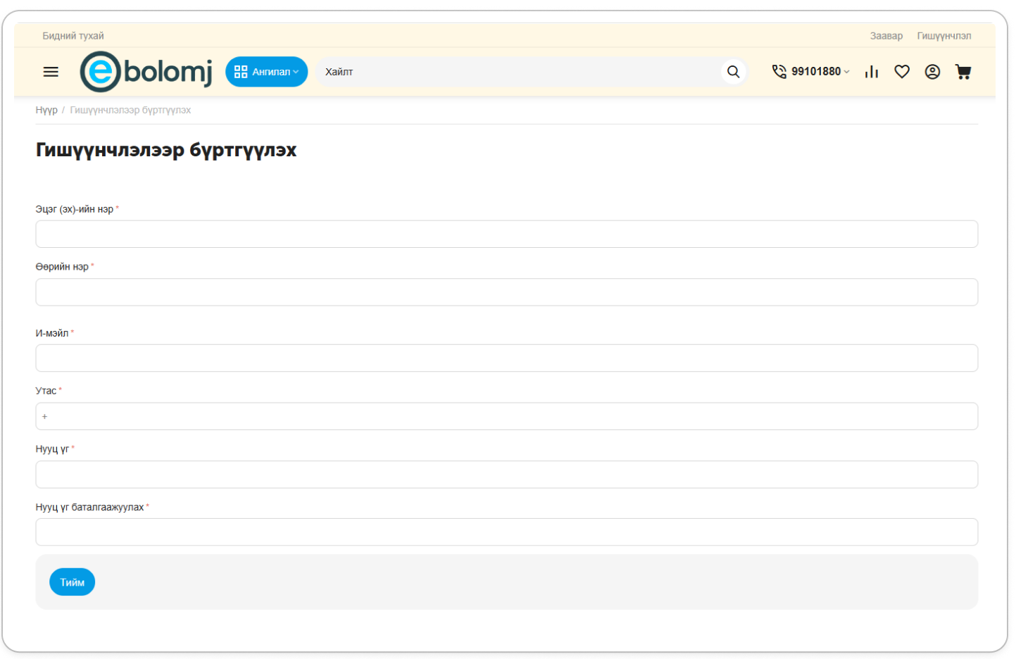Та сайтын үндсэн нүүр хуудасны баруун дээд буланд байрлах товчийг дарж бүртгүүлэх товчийг нээнэ.