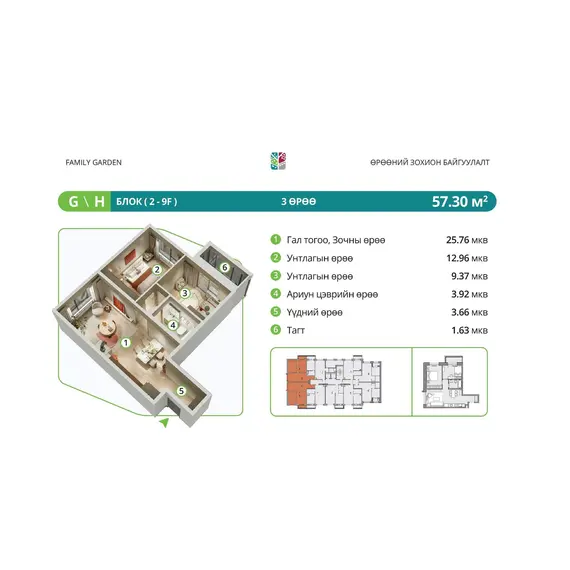 Гэр бүлийн гишүүн бүрт ээлтэй Family garden apartment57.3мк 3 өрөө танилцуулга Орчин үеийн шинэлэг тоглоомын талбай Тэжээвэр амьтдын бүс Ахмад настнуудын тухлах бүс 250м ногоон гудамж 800м гүйлтийн зам Усан оргилуур Сагсан бөмбөгийн талбай Хөлбөмбөгийн талбай Winter garden Гацуур мод Хан-уул дүүрэг 8-р хороо, Яармагийн морин тойруулгын чанх урд байрлалтай, 2200 айлын орон сууцын төсөл